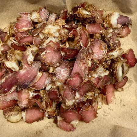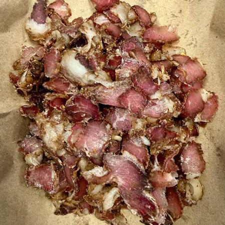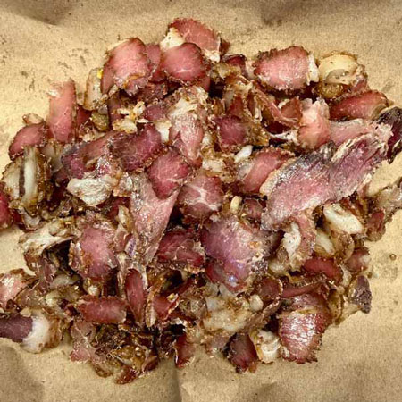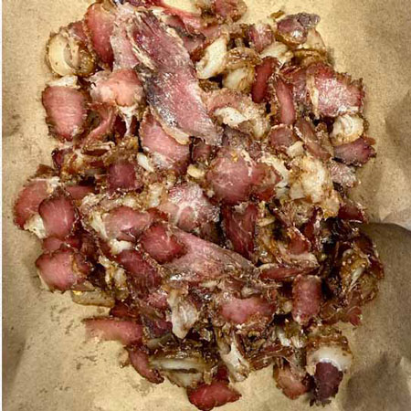 Made by thinly slicing whole pieces of ready air dried Tongg. Tongg spices: Blend of coriander, white pepper and salt
